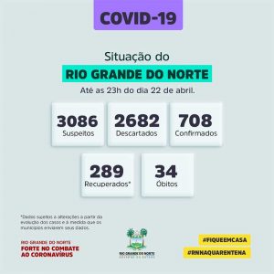 O Rio Grande do Norte ultrapassou a marca de 700 casos do novo coronavírus, segundo dados da Secretaria Estadual de Saúde Pública (Sesap). O número de mortes causadas pelo vírus subiu para 34, cinco a mais da quantidade divulgada nesta quarta-feira (22).