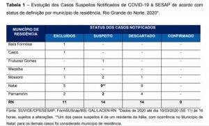 Até o momento, não há caso confirmado de COVID-19 no Rio Grande do Norte, onde foram descartados 14 casos.