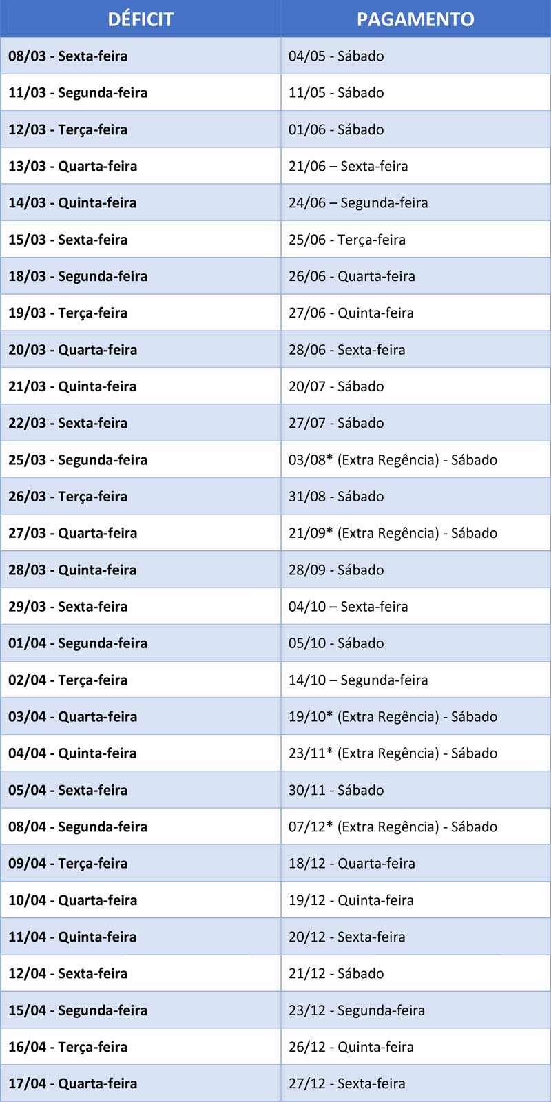 Tabela com dias de déficit e proposta de reposição feita pelo SINDISERPUM