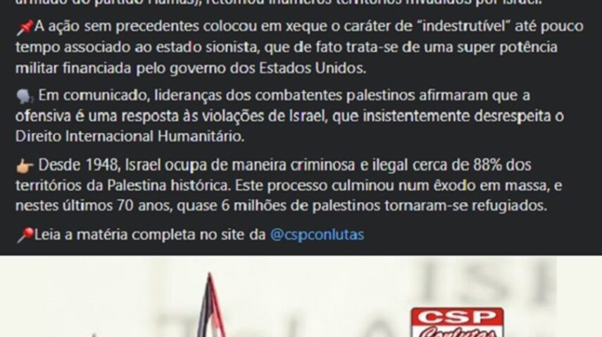 Principal assunto do mundo nos últimos dias, o ataque do grupo militante Hamas contra Israel foi repercutido pelo Sindicato dos Trabalhadores em Saúde do Rio Grande do Norte (Sindsaúde-RN). A entidade defendeu a ação terrorista e a classificou como “eventos protagonizados pela heroica resistência do povo palestino”. A publicação foi compartilhada na página do Facebook do sindicato nessa segunda-feira (9).