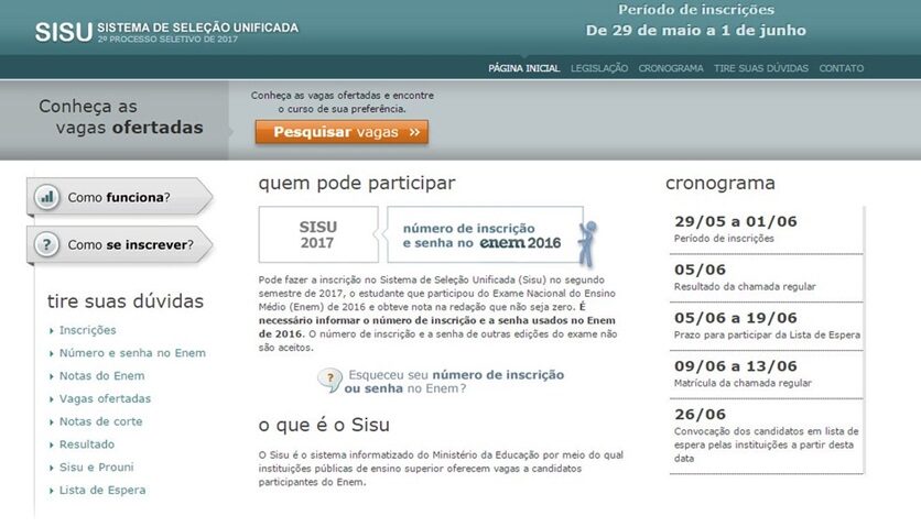 O Ministério da Educação (MEC) abre hoje (29) as inscrições para a segunda edição do Sistema de Seleção Unificada (Sisu), que poderão ser feitas no portal do programa, na internet, até o dia 1º de junho. Para se inscrever, o candidato precisa apenas de seu número de inscrição e senha cadastrados no Exame do Ensino Médio (Enem) de 2016.