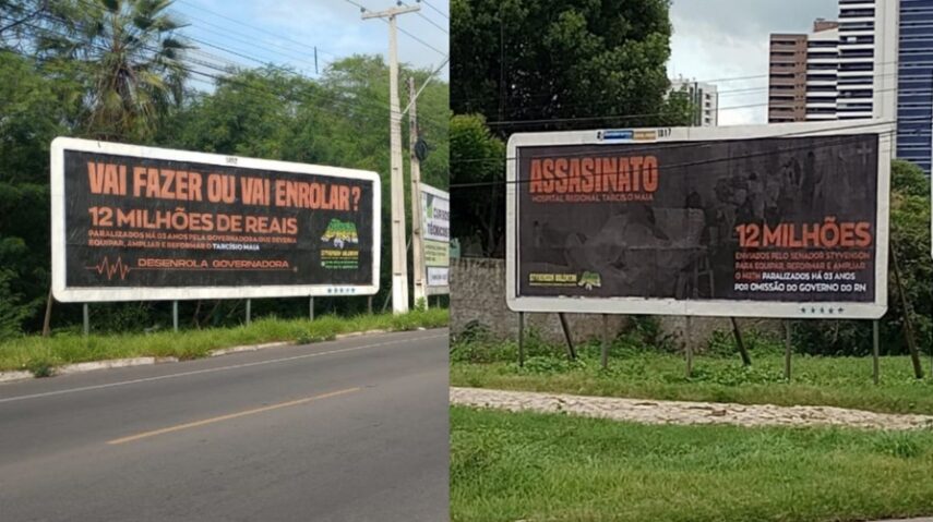 As propagandas instaladas nas principais avenidas da cidade têm um tom forte, considerando como “assassinato” a não aplicação dos recursos pelo governo Fátima Bezerra (PT).