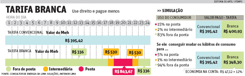 Com a tarifa branca, o consumidor passa a ter a possibilidade de pagar valores diferentes em função da hora e do dia da semana em que consome a energia elétrica. Se o consumidor adotar hábitos que priorizem o uso da energia nos períodos de menor demanda (manhã, início da tarde e madrugada, por exemplo), a opção pela tarifa branca oferece a oportunidade de reduzir o valor pago pela energia consumida. Nos dias úteis, a tarifa branca tem três valores: ponta, intermediário e fora de ponta. Esses períodos são estabelecidos pela ANEEL e são diferentes para cada distribuidora. Verifique aqui.