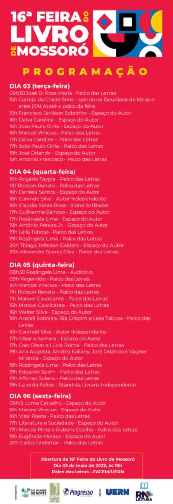 “Podemos dizer que a Feira do Livro de Mossoró está renascendo. Depois de dois anos sem realizá-la, por causa da pandemia, conseguimos, com o envolvimento da Uern e do Governo do Estado, trazer de volta um dos principais eventos literários do Nordeste. Com a 16ª edição, a Feira do Livro de Mossoró começa agora, em 2022, um novo capítulo da sua história. Esperamos poder contar com a visitação e o engajamento de sempre da população mossoroense e região”, afirmou o organizador da Feira, Rilder Medeiros.