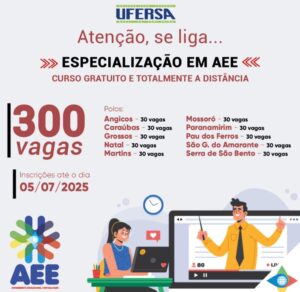 A Universidade Federal Rural do Semi-Árido (UFERSA), por meio do Núcleo de Educação a Distância (NEaD), está com inscrições abertas até o dia 5 de julho de 2025 para o Curso de Especialização em Atendimento Educacional Especializado (AEE), ofertado na modalidade a distância através do Sistema Universidade Aberta do Brasil (UAB), conforme o Edital 006/2025.