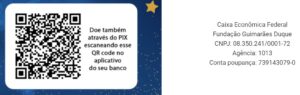 Além dos alimentos entregues diretamente nos pontos de coletas, a campanha “Natal sem Fome” também está recebendo doações em dinheiro, diretamente em uma conta mantida pela Fundação Guimarães Duque – FGD exclusivamente para este fim, conforme dados abaixo e QR Code. O valor arrecadado será revertido na compra de alimentos não perecíveis para as cestas.