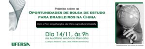 A Ufersa recebe nesta quinta-feira, dia 14, o professor Song Zhenghe, da China Agricultural University – CAU, em uma palestra sobre as oportunidades de bolsas de estudo para brasileiros no país asiático. O encontro será às 9h, no Auditório Amâncio Ramalho, no Prédio da Reitoria, Lado Leste do Campus Mossoró. A entrada é gratuita e não precisa de inscrição.