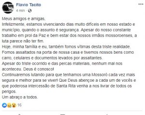 No Facebook, ele aproveitou o texto para denunciar a falta de segurança no estado e no município de Mossoró. “Infelizmente, estamos vivenciando dias muito difíceis em nosso estado e município, quando o assunto é segurança”, destacou o vereador.
