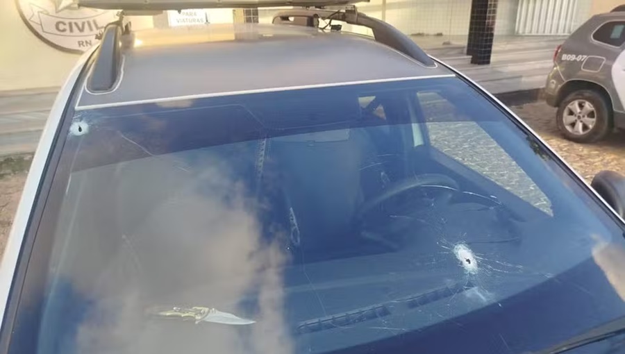 Uma viatura da Polícia Militar foi atingida por pelo menos dois disparos durante um confronto entre militares e criminosos na madrugada desta quarta-feira (5) na Zona Leste de Natal.