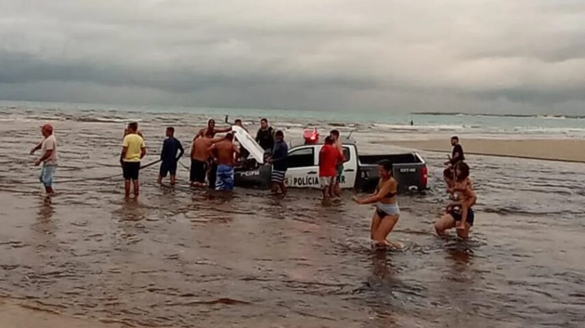 Para retirar o veículo do mar, os policiais contaram com o apoio de populares, que auxiliaram com um veículo 4×4. O carro foi recolhido para o posto policial da região e passará por manutenção.